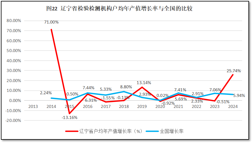 由图18可见,辽宁省检验检测机构人均年产值增长曲线在2023年之前都比较平坦,没有出现太大的增长峰值,增长动能不足,且与全国的增长率曲线的距离越拉越大,但2024年度出现了一个较为显著的增长,与全国的差距有所缩小。