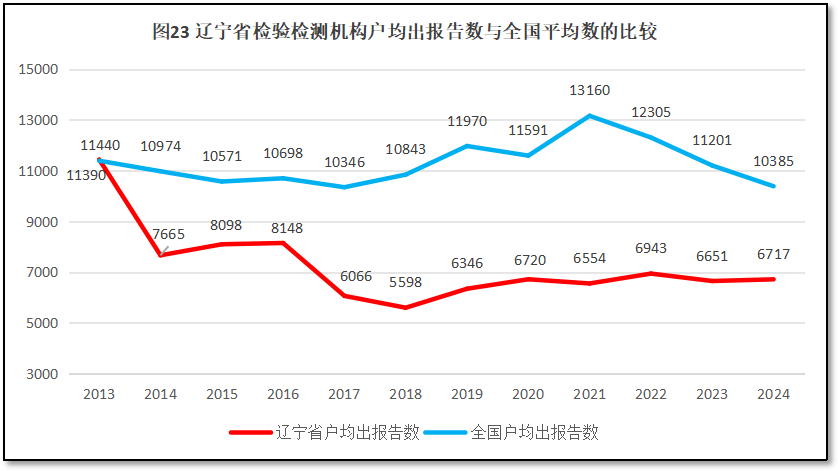 由图23可见,12年来,辽宁省检验检测机构户均出报告数量在2014-2018年期间逐步减少,此后基本稳定在6300份左右。2024年户均出具报告6717份,仅比2023年度增加66份。由于全行业户均出具报告数量呈现逐步减少的趋势,保持稳定的辽宁省与全国的平均数的差距有所缩小,2024年辽宁省户均出具的报告数量比全国平均数低了3668份。